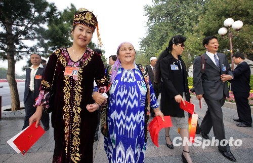 10月1日,中华人民共和国成立60周年庆祝大会开始前,在京参加第五次全国民族团结进步表彰大会的少数民族代表抵达庆典现场。中新社发 刘震 摄