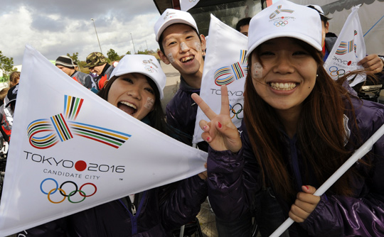 图为东京申奥支持者在哥本哈根街头为东京申奥造势。