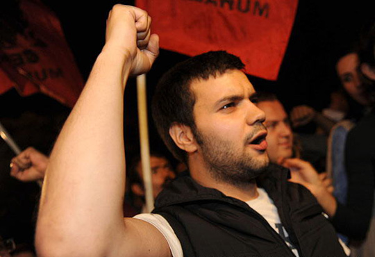 “扔鞋”学生塞尔丘克·厄兹贝克在被警察释放后高喊口号。