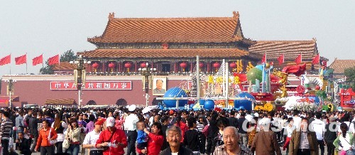2009年10月6日,北京天安门广场上的游人如潮。“十一”黄金周期间,众多游客前往北京天安门广场参观游览,感受热烈的国庆气氛。