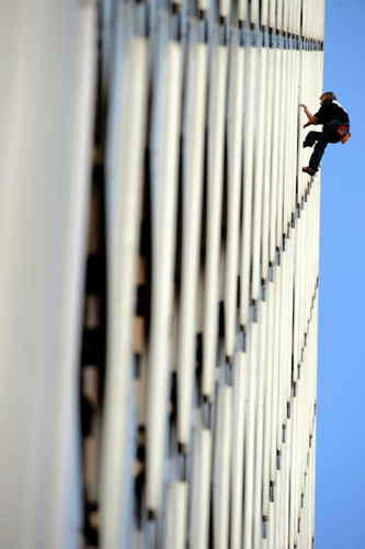 10月8日,在法国巴黎郊外拉德芳斯,素有“蜘蛛侠”之称的法国登山者阿兰•罗伯特徒手攀登230米高的阿丽亚娜大楼。这名“蜘蛛侠”从11岁开始登山,并以成功登上60多个建筑而闻名世界。