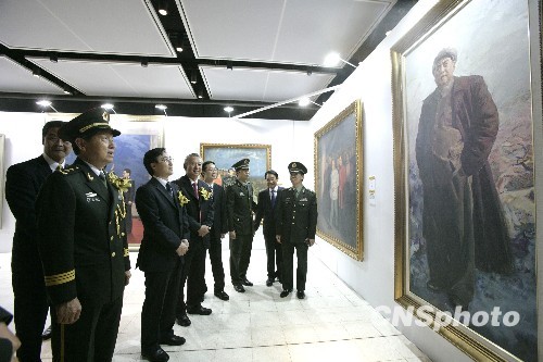 图为中国人民解放军驻香港部队政委刘良凯中将等观看油画作品《东方·毛泽东》。中新社发 张勤 摄