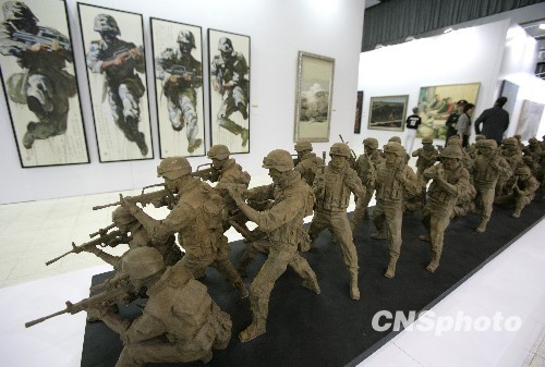 展览作品为近年来在全国、全军大型美术展览中获奖的艺术精品,主要内容分为辉煌历程、军民情深、当代军营、心系祖国四个部分。中新社发 张勤 摄