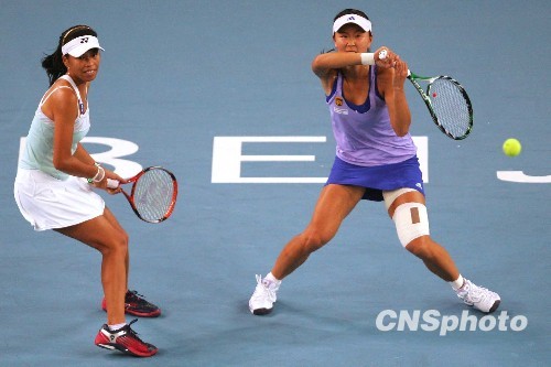 海峡两岸组合中国选手彭帅(紫衣者)和中华台北的谢淑薇夺得了2009年中国网球公开赛的女双冠军。中新社发 富田 摄