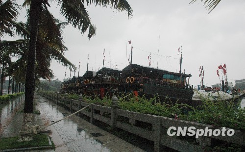 今年第十七号热带风暴“芭玛”10月12日9时50分在海南东部的万宁市龙滚镇登陆。受其影响,海南23926艘渔船回港或就近入港避风.图为在海口海甸溪停泊的渔船。中新社发 王辛莉 摄