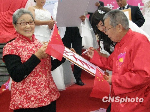 10月12日上午,50对新人在四川宜宾市合江门地标广场举行了一场隆重而又温馨的集体婚礼。10对金婚老人来到现场为新人们送上关怀和祝福。金婚老人拿起手中的笔,描绘出幸福的“家”。中新社发 曾志鹏 摄