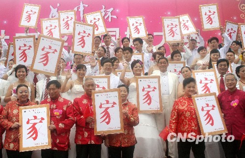 10月12日,享有“万里长江第一城”美誉的四川省宜宾市在长江、金沙江、岷江接合部举行“盛世中华”集体婚典,50对佳偶举行了庄严的升国旗仪式,共同完成了“家”字的书写,她们面对滚滚长江许下美好心愿,祝福祖国更加繁荣昌盛、国富民强。中新社发 陈涌徐伟 摄