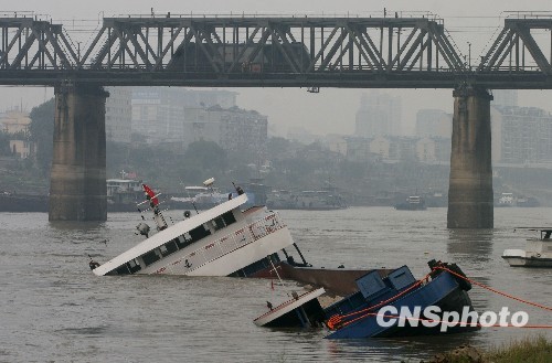 10月13日下午2时许,一艘满载千余吨河沙的货船在武汉市汉江龙灯堤段倾斜侧翻,幸无人员伤亡。中新社发 摄记 摄