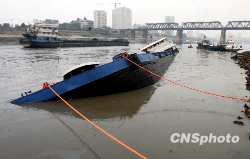 图:满载千余吨河沙货船在汉江侧翻(2)
