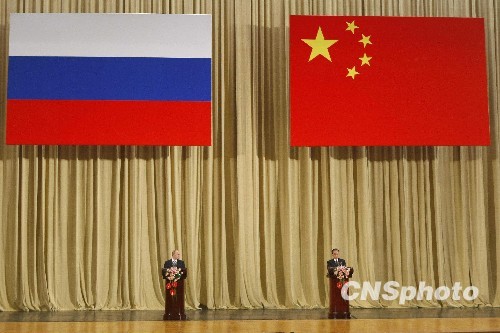 温家宝与普京总理出席中俄建交六十周年庆祝大会暨中国“俄语年”闭幕式。中新社发 盛佳鹏 摄