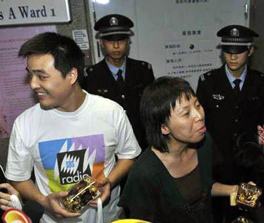 图为李湘顺利诞下爱女后助手派发喜糖。