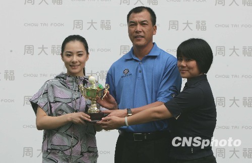 图为周大福珠宝品牌总监赵芳小姐将“一击即中”奖杯赠送中国运动员教育基金。中新社发 乔立娟 摄