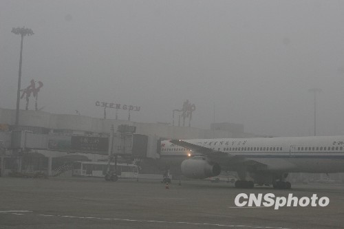 10月14日早晨5:30左右,成都地区遭遇今年入秋以来首场大雾天气。受此影响,成都双流机场被迫关闭2个半小时,造成63个进出港航班延误,5000多名出港旅客受阻于机场,为此机场发布了三级预警信号。中新社发 吕俊明 摄