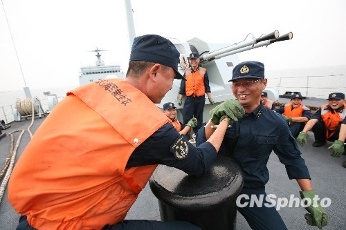 南海舰队首届国防生岗前集训大队426名国防生近日在湛江某军港登上两艘新型登陆舰,进行为期10天的海上实习,这是南海舰队“瞄准高技术战争,锻造跨世纪人才”的重要举措。图为训练之余,国防生与舰上黎升建教导员擂台比武。中新社发 仲继军 摄