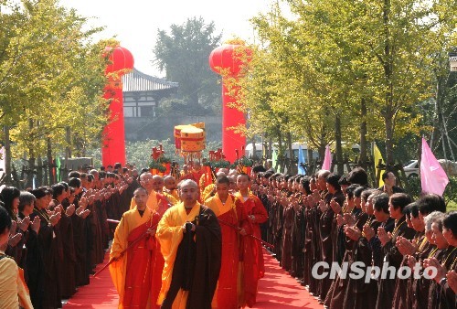 法会由中日韩三国法师共同主持,唱梵音礼赞,祈福世界和平、中日韩人民友谊世代相传。其间 举办“中日韩佛教论坛”、 “中日韩书法笔会”等活动。中新社发 崔佳明 摄