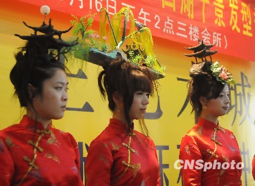 10月16日,杭州上演西湖十景头上秀,十位发模的另类发型吸引了众人的目光。 中新社发 引炜 摄
