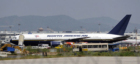 一架美军租用的波音767飞机停在印度孟买国际机场的停机坪上。