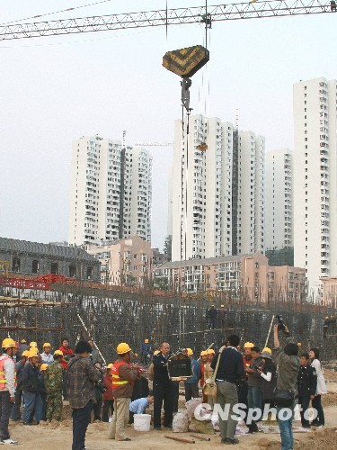 图为塔吊正在运走挖出的炮弹。中新社发 李光 摄