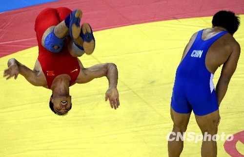 10月18日,全运会古典式摔跤96KG级别决赛中,山东队的姜华琛(红方)战胜江苏选手邵欢(蓝方),为东道主山东队摘得一枚金牌。图为获胜后姜华琛做出空翻动作以示庆祝。中新社发 刘震 摄