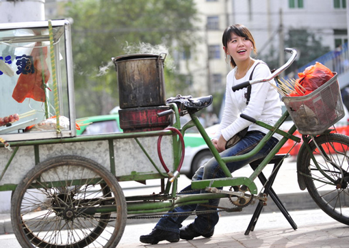一个青春、靓丽、时尚的女孩子,在大学校园旁卖起冰糖葫芦。