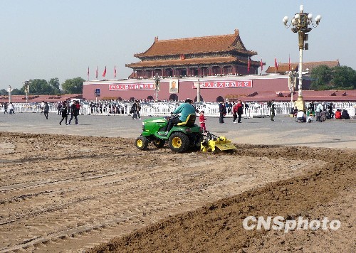 10月20日,绿化工作人员开始对天安门广场东、西两侧国庆期间摆放彩车的地表进行修整,为重新铺设草坪做准备。