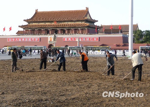 图为北京天安门广场上工人加紧翻耕土地。中新社发 玉龙 摄