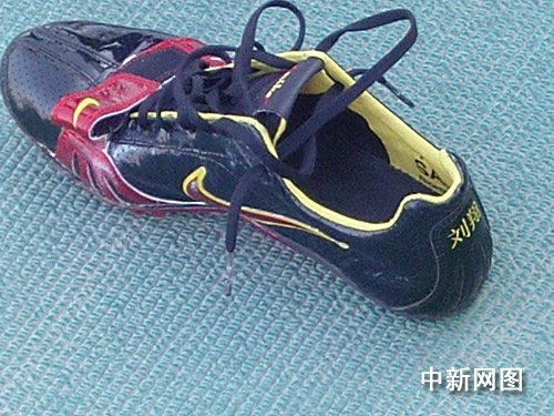 黑鞋是相对软一些、舒适一些的的旧鞋,有利于保护刘翔的伤脚。 翁阳 摄