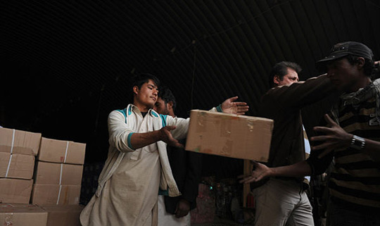 工作人员在阿富汗首都喀布尔往卡车上装选举投票资料。