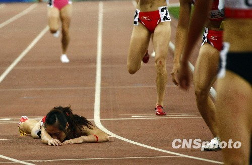 10月22日晚,全运会女子七项全能800米比赛中,辽宁选手刘海莉由于体能严重透支,冲刺结束后倒在跑道上。中新社发 刘震 摄