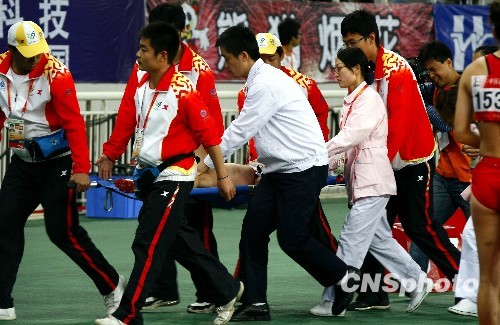 图为刘海莉被担架抬出赛场。中新社发 刘震 摄