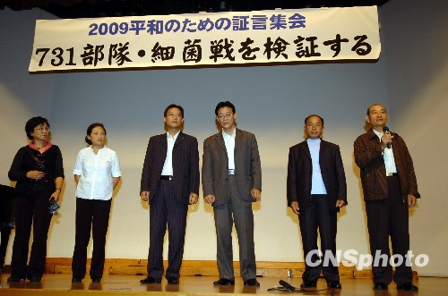 10月22日晚,来自中国的日本731部队细菌战受害者徐万智(右一)、高业君(右二)在两名中国学者和原细菌战原告团团长王选(左二)等人的陪同下出席了在东京举行的和平集会“2009为了和平的证言——验证731部队·细菌战”。徐万智还在集会上讲述了自己全家十一口中五人死于细菌战的悲惨经历。