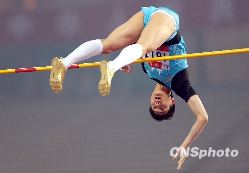 10月22日晚,山东选手刘飞亮在第十一届全运会男子撑杆跳高巅峰比拼中,勇敢冲击新高度5.80米,最后以5.60米的成绩夺得冠军。中新社发 陈文 摄