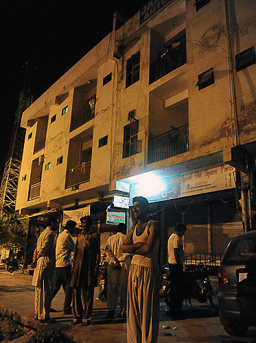 图为巴基斯坦伊斯兰堡市民站在楼外避险。