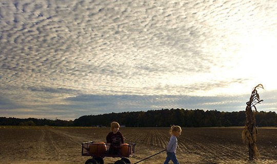 图为10月22日美国伊斯顿一个小女孩拖着载有她弟弟和南瓜的小车。