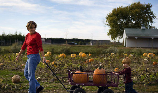 图为10月22日美国伊斯顿一名女子带着孩子穿行在南瓜田间。