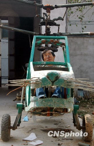 10月23日,山东省郯城县马头镇郁顶村农民宋明武对改造后的直升机进行第九次试飞。中新社发 房德华 摄