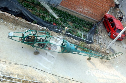 10月23日,山东省郯城县马头镇郁顶村农民宋明武对改造后的直升机进行第九次试飞。中新社发 房德华 摄
