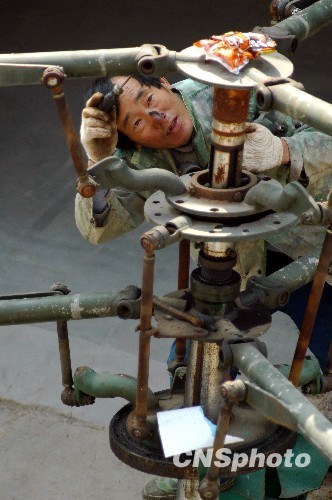 10月23日,山东省郯城县马头镇郁顶村农民宋明武对改造后的直升机进行第九次试飞。中新社发 房德华 摄