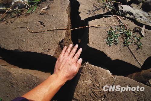 10月23日,长江九江段水位降低,裸露出来的江滩上,一道道宽宽的裂缝。受江西省缺雨和长江上中游来水量减少,及三峡大坝蓄水的影响,长江下游水位退落较快。当日14时长江九江段水位9.64米,较昨日下降6厘米。目前, 长江下游九江、安庆、芜湖、南京等地水位已退至1986年以来历史同期最低值,长江航道通航形势日趋严峻。 中新社发 胡国林 摄