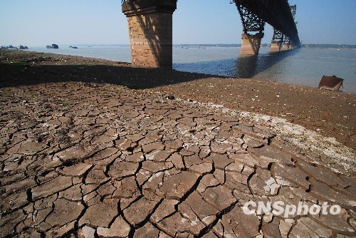 10月23日,长江九江段水位降低,裸露出来的江滩上,一道道宽宽的裂缝。中新社发 胡国林 摄