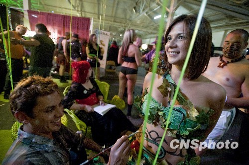 当地时间10月24日,旧金山举行盛大另类舞会,图为一位美少女穿着绿色、由可回收材料制作的"比基尼"裙装。中新社发 陈钢 摄