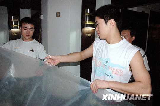 10月26日,在位于伊拉克首都巴格达的中国驻伊大使馆内,使馆工作人员裁剪塑料布,用于临时蒙住受损门窗。在25日发生的巴格达自杀式连环汽车爆炸袭击中,中国驻伊使馆和新华社巴格达分社所在的曼苏尔饭店受到波及,使馆和分社所在房间严重受损,目前使馆已开始着手清理修补馆舍。