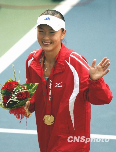 图为彭帅领奖后向观众致意,这是她在本届全运会上获得的第四枚金牌。中新社发 张宇 摄