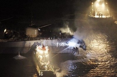 二十七日晚当地时间七点五十六分前后,日本海上自卫队护卫舰“KURAMA”号与韩国籍集装箱船“CARINA STAR”号相撞着火。