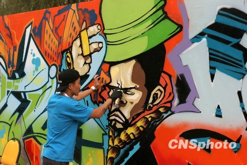 10月27日,武汉汉口江滩,参加涂鸦比赛的队伍在创作。25日开始,涂鸦比赛“战墙”中国赛区比赛在武汉汉口江滩举行,湖北、北京、香港等全国各分赛区的优胜队伍参加此次比赛,最后胜出的队伍将代表中国与其他亚洲国家代表队比赛。据了解,此次比赛包括:在指定的长10米、高2.3米的墙上自定义涂鸦,评委给命题参赛者在几分钟内完成喷绘小样,参赛者现场就指定单词设计涂鸦签名等3个环节。中新社发 孙新明 摄