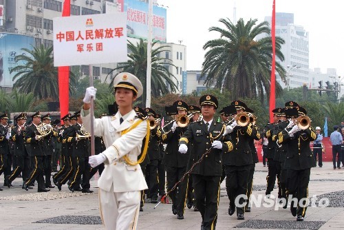 图为中国人民解放军军乐团通过南昌八一广场进行军乐游行。中新社发 马裕淇 摄