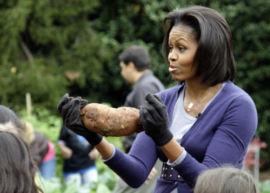 图为米歇尔奥巴马手捧刚刚挖出的红薯。