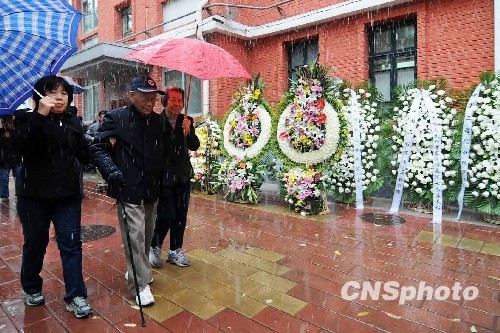 11月1日,钱学森院士位于北京的家中设立灵堂,接受吊唁。图为“中国航天四老”之一、94岁的任新民(左二)先生前来吊唁。中新社发 富田 摄