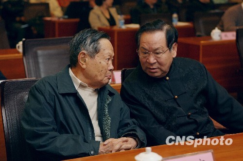 11月1日,参加清华国学院成立大会的清华大学校长顾秉林身着唐装与著名科学家杨振宁交谈。中新社发 苏丹 摄