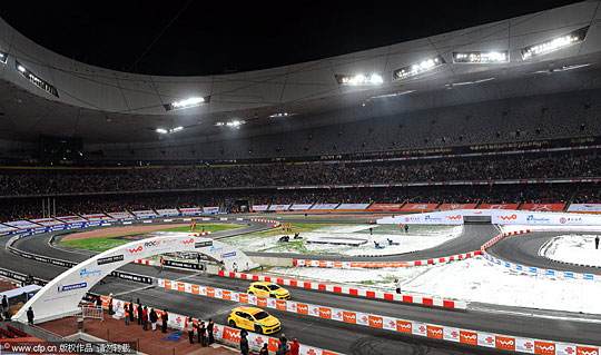 11月2日,09ROC世界车王争霸赛在北京国家体育馆举行首日比赛。众多娱乐明星进入赛场进行赛车比赛。